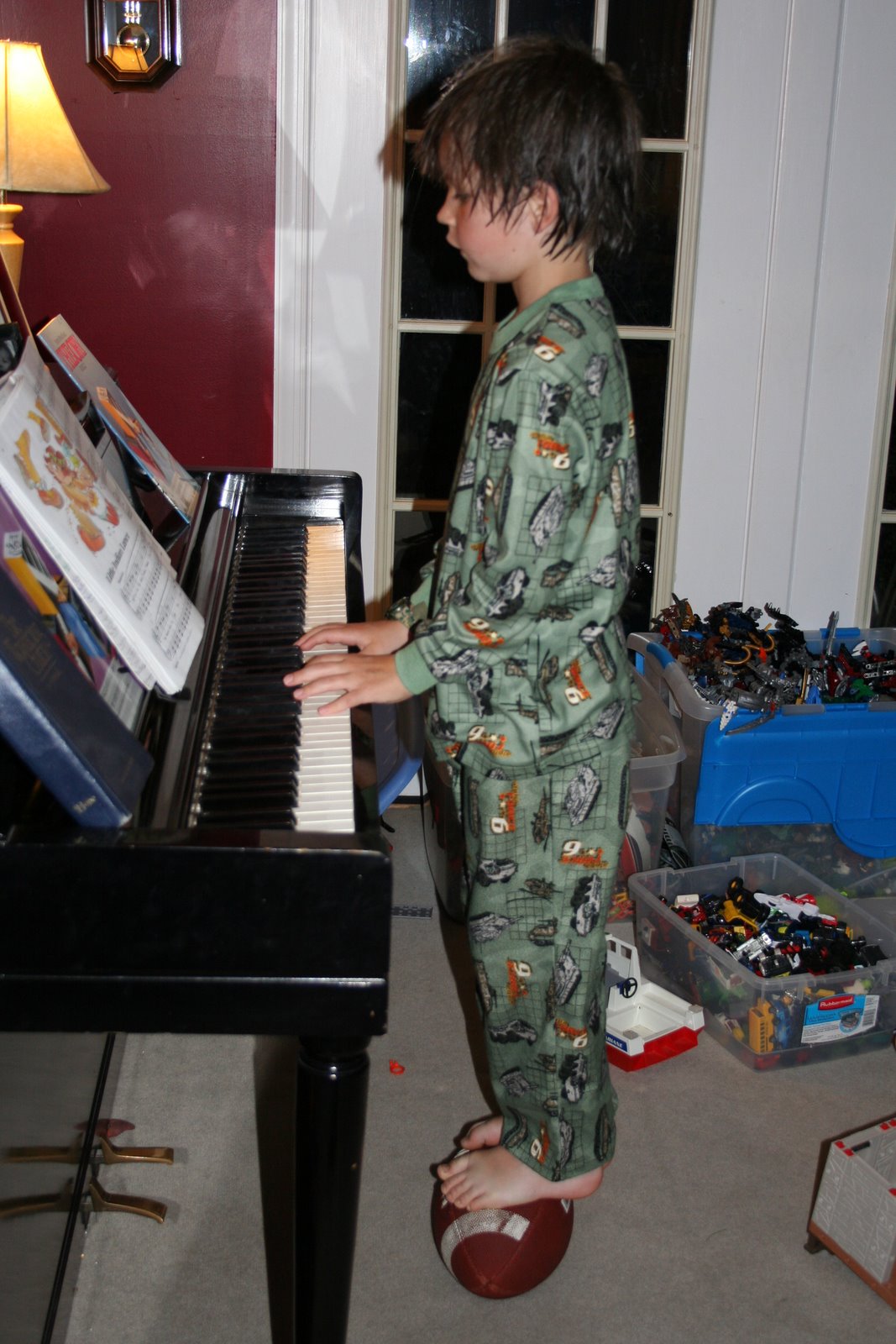 So where do you sit when you’ve removed the piano bench to the other side of the room and turned it on its side so that it functions as a Very Essential Barricade to aid you in your defense in your Nerf gun battle with your brother?